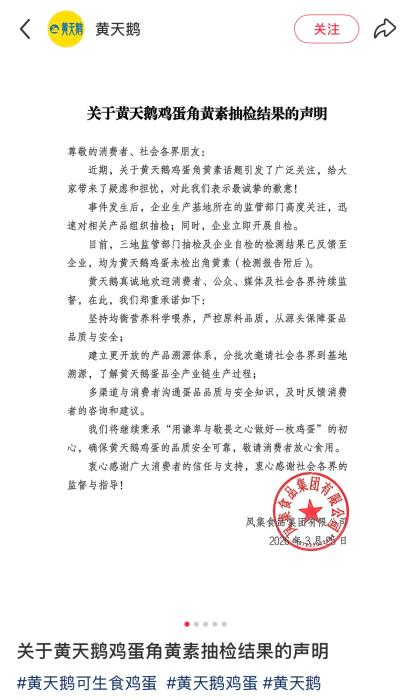 含量高达1.65mg/kg,黄天鹅质疑将“检出角黄素”等同于“添加人工合成色素”,称正在许昌胖东来采办的黄天鹅鸡蛋角黄素含量为0.399mg/kg。消费者等候的并非反转取拉锯辩论。国度答应做为饲料添加剂限量添加正在蛋鸡饲猜中,并于3月25日发布抽检成果。黄天鹅发布角黄素抽检成果声明并附检测演讲。因而质疑原料或添加环节存正在较着问题。”该报道称,企业同步开展自检。不属于人工添加。能够判断为天然含量,另据报道,此前黄天鹅已做出强硬回应,随后,